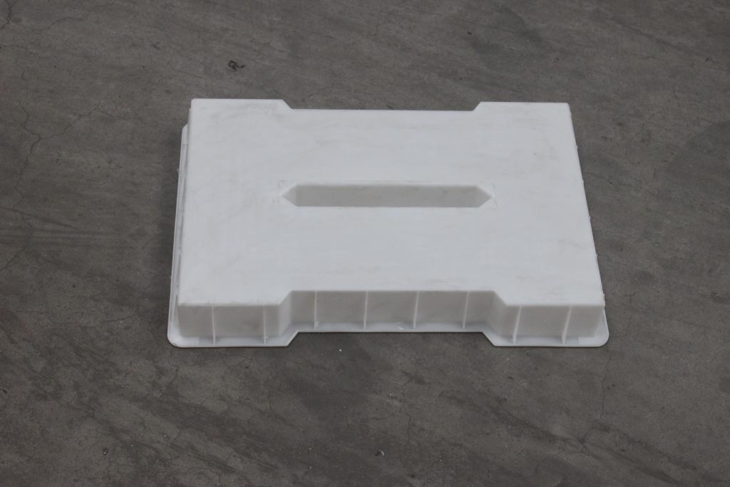 此款為塑料材質的路基缺口預制溝蓋板模具,主要以雙邊缺口及中孔下水橫條設計,主要用于安紫高速公路路基邊溝建設。其中所制水泥缺口蓋板厚度高達10CM,對于公路邊溝的安全穩定意義重大。