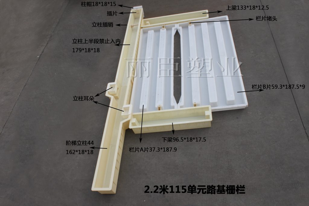 針對不同施工要求,除此2.2米115單元的路基柵欄塑料模具之外,麗臣秉借多年客戶需求積累,也相應(yīng)提供2.2米159單元、2.2米300單元、1.8米159單元、1.8米3單元、1.8米115單元等一系列塑料路基柵欄模具,歡迎垂詢。