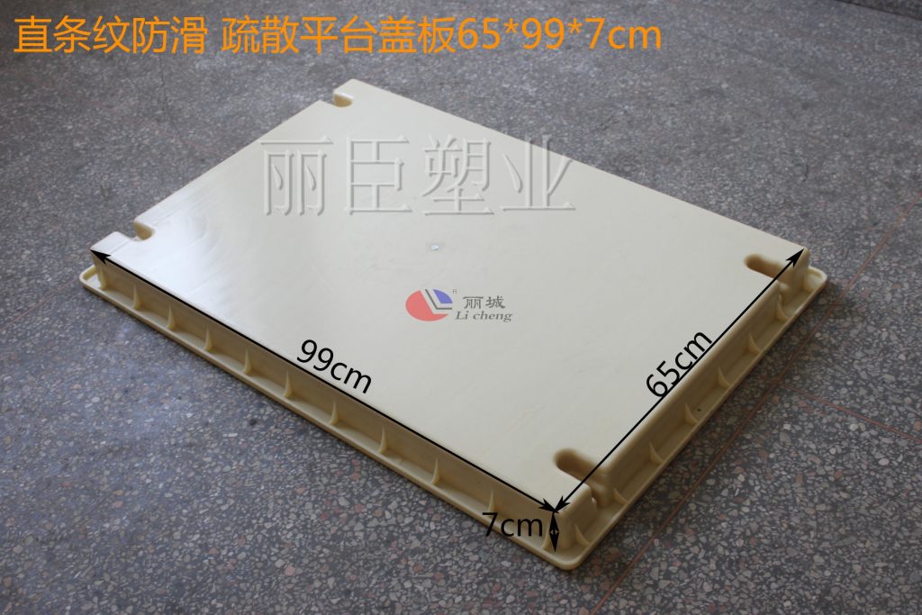 這款直條紋疏散平臺蓋板塑模設計上與別的疏散蓋板不同,以直條紋的形式來作為主要設計圖案,條紋的設計能有效加大人與地面的摩擦力,即便在潮濕的地面上也能較好的減少人的滑倒。四周都設計了缺口堵頭,對后期安裝上也能有效的減少安裝時間。