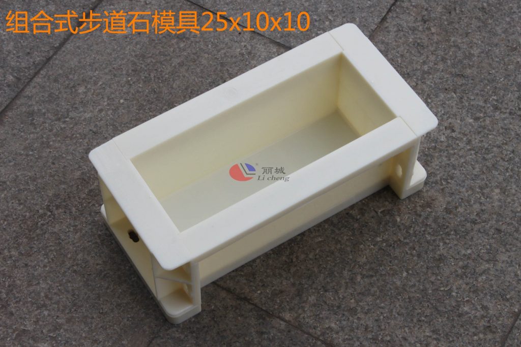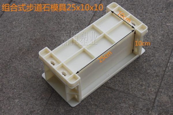 其塑料模具本身的規格的25x10x10cm,而堵在模具兩邊的堵頭規格為10x10cm。這樣的設計主要是對于步道石模具在澆筑成型后脫模過程中較為便利,只需將固定組步道石模具的鎖扣進行拆除后,便能較為便利的進行模具的脫模,所以麗臣在對著款模具上取名為組合式步道石模具。