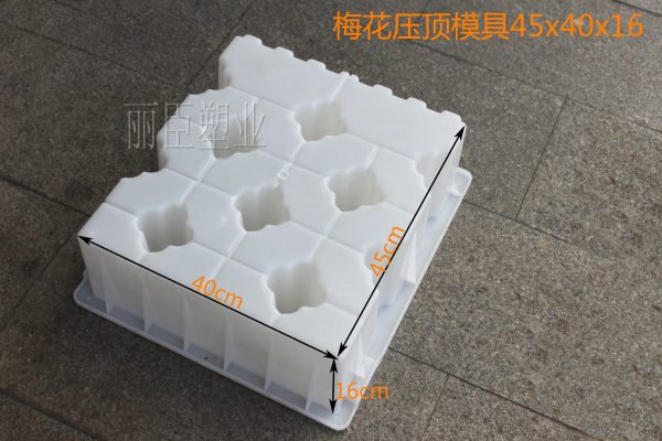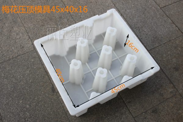 這款壓頂塑料模具是與之前那款水利護岸模具40x40x20-21cm互相搭配而設計研發的。梅花壓頂塑料模具設計主體外觀呈現長方形,壓頂模具上方有設計壓條配置,下面就跟著小編一起去詳細的了解一下這款梅花型水利壓頂模具吧。