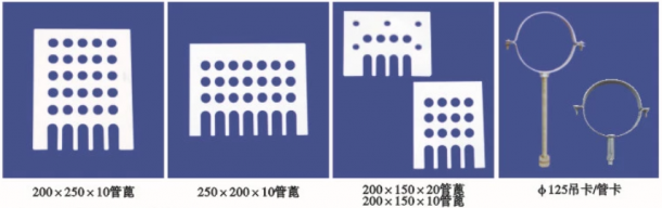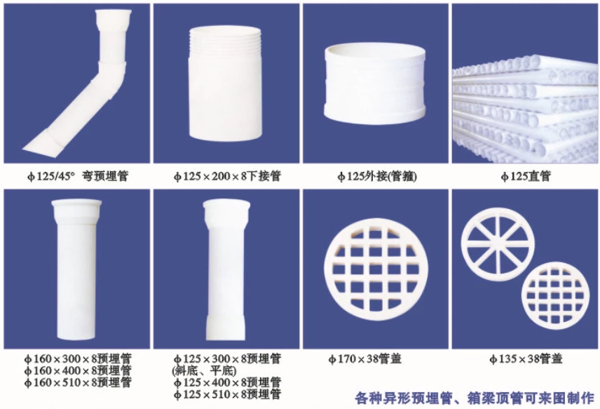 Φ125/90°彎頭,Φ125/90°帶口彎頭,Φ125/90°帶疏通正角彎頭,Φ125三通,Φ125帶疏通三通,Φ125/45°彎管,Φ125/15°彎管,Φ125/45°彎預(yù)埋管,Φ125*200*8下接管,Φ125外接管箍,Φ125直管,Φ160*300*8、Φ160*400*8、Φ160*510*8預(yù)埋管,Φ125*300*8斜底、平地預(yù)埋管,Φ125*400*8、Φ125*510*8預(yù)埋管,Φ170*38管蓋,Φ135*38管蓋,200*250*10管篦,250*200*10管篦,200*150*10、200*150*20管篦及Φ125吊卡管卡等多種配件。